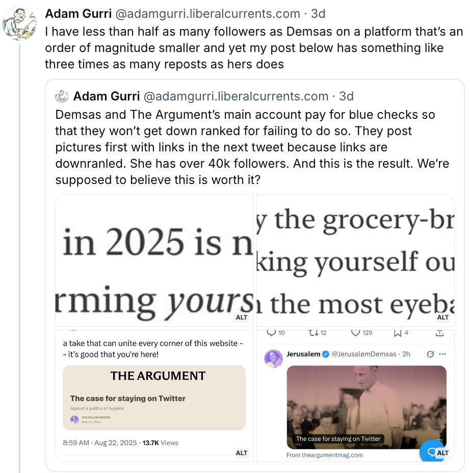 Today’s Mad Libs was inspired by my column on Friday, “The case for staying on Twitter.” Unsurprisingly, it was not very popular on Bluesky, where Adam Gurri, editor-in-chief of Liberal Currents, dunked on me for not getting more likes when I posted my piece on Twitter. Sad!