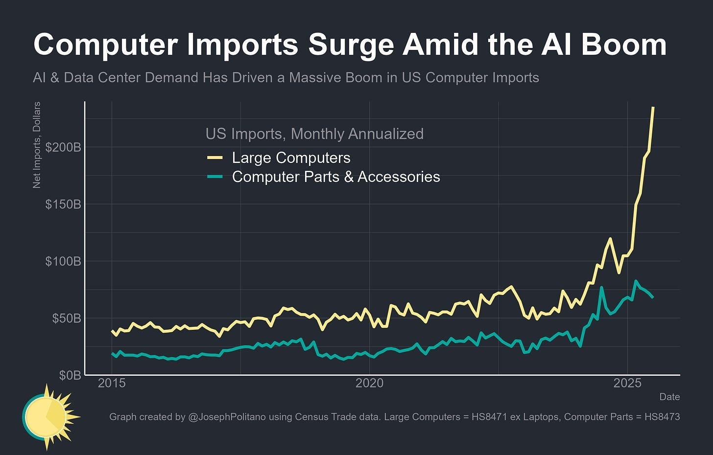 As the economics writer and The Argument contributor Joey Politano reported, computer imports surged in 2025, and the AI companies have saved billions of dollars on additional import taxes thanks to these exemptions. “The current AI boom would simply be impossible if tech companies had to pay the same tariffs that car manufacturers or homebuilders currently face,” Politano wrote.