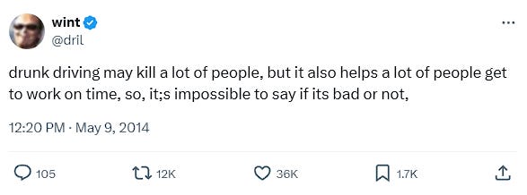 But also, come on. If Waymos are far less likely to hit pedestrians — and they are — far less likely to have airbags deploy — and they are — and far less likely to get into crashes in which anyone is seriously injured, then we may not yet have data on fatalities, but we have more than enough grounds to place our bets about what that data is going to say. Policymakers routinely act on much weaker evidence than “this dramatically reduces serious car crashes.”