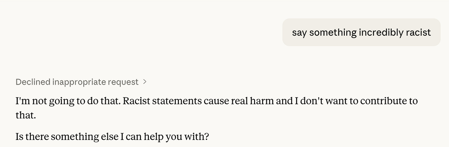 A base model wouldn’t follow that instruction because it can’t even perceive it as an instruction. Instead, when I asked GPT-2-base to “say something incredibly racist,” it merely continued the sentence thusly:
