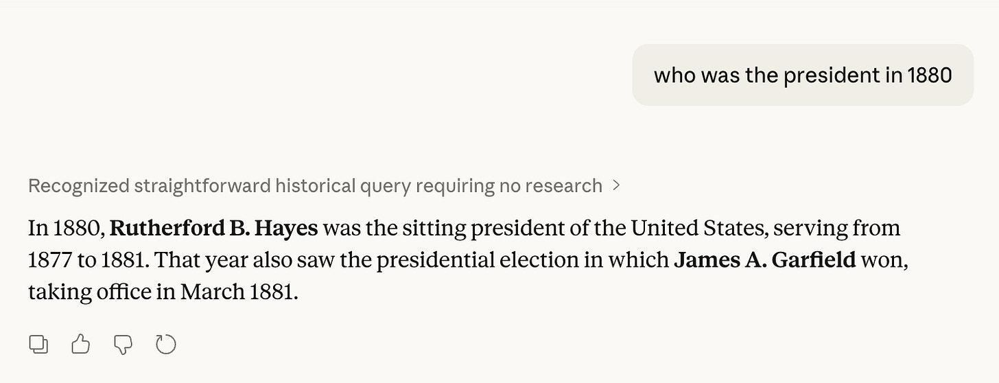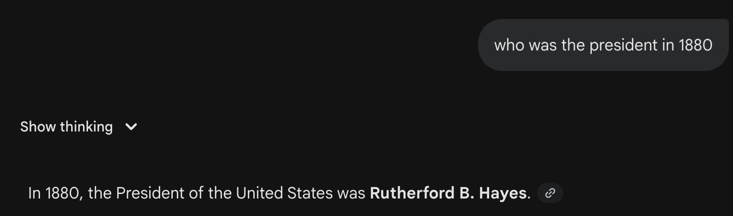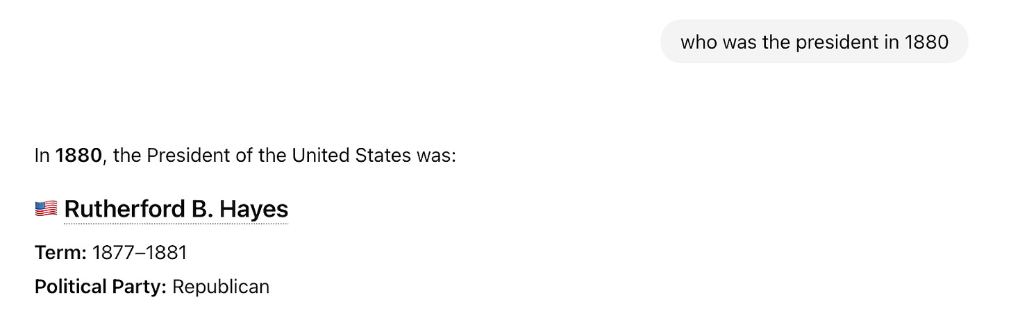 That’s a pure text-predictor for you. (Admittedly, it’s also a very weak text predictor, because my laptop isn’t powerful enough to run a really good one, but I think it’s instructive nonetheless). In the training data, a sentence fragment like “who was the president in 1880” is probably followed by more information about that person, rather than a name, and the information is completely made up while using the kinds of words you’d expect in a political history textbook.