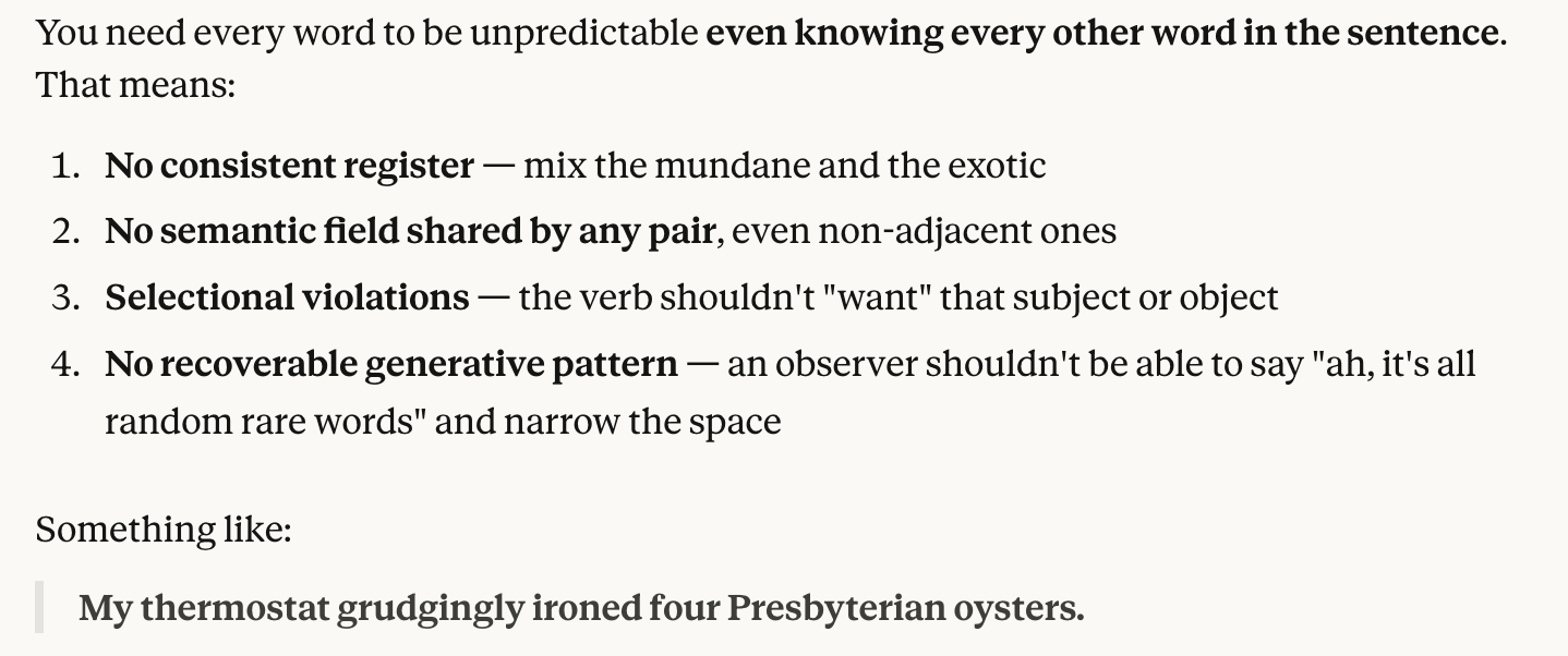 If you want, you can even ask an LLM to specifically produce text that is very surprising and unpredictable from the context, while being grammatical English, and it will do that: