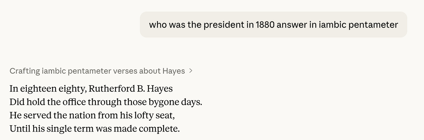 The poets in the audience are going to complain that this isn’t very good poetry — objecting, perhaps, that “the iambic pentameter is inconsistent. The first line, ‘In eighteen eighty, Rutherford B. Hayes,’ doesn’t scan cleanly as five iambic feet. ‘Rutherford’ is a dactyl (stressed-unstressed-unstressed), which disrupts the rhythm. ‘Lofty seat’ and ‘bygone days’ are clichés. The whole thing reads like it was assembled from stock phrases rather than crafted with care.”
